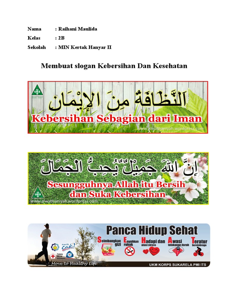 Contoh poster kebersihan kebersihan merupakan sebagian dari iman sebagai seorang muslim itu harus menjaga kebersihan baik lingkungan dan hati. Contoh slogan kebersihan dalam bahasa indonesia. Anti risih bila lingkungan telah bersih. Jaga hati, pikiran, dan kebersihan lingkungan. Bersih itu indah, higienis itu anugerah. Lingkungan higienis untuk hidup yang lebih jernih. Annazofatu syathrun minal iman artinya: Bahkan kita sendiri sering mendengungkan untuk menghimbau agar menjaga kebersihan sebagai pangkal kesehatan kita. Kebersihan adalah sebagian dari iman. Mari bersama menjaga kebersihan lingkungan. Lingkungan higienis untuk hidup yang lebih jernih. Dari beberapa keterangan di atas, bahwa slogan kebersihan sebagian dari iman memiliki makna yang begitu dalam, yakni bukan saja bersih lingkungan, pakaian saja, melainkan meliputi kebersihan tubuh, harta, fikiran hingga hati. Arti penting dibalik slogan kebersihan sebagian dari iman kanvas putih from ldiisurabaya.org kebersihan adalah sebagian dari iman ,menjaga kebersihan berarti menjaga iman.